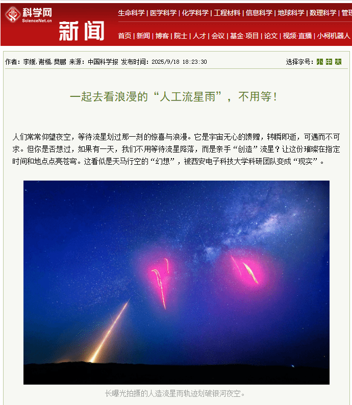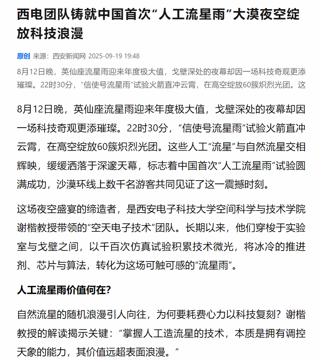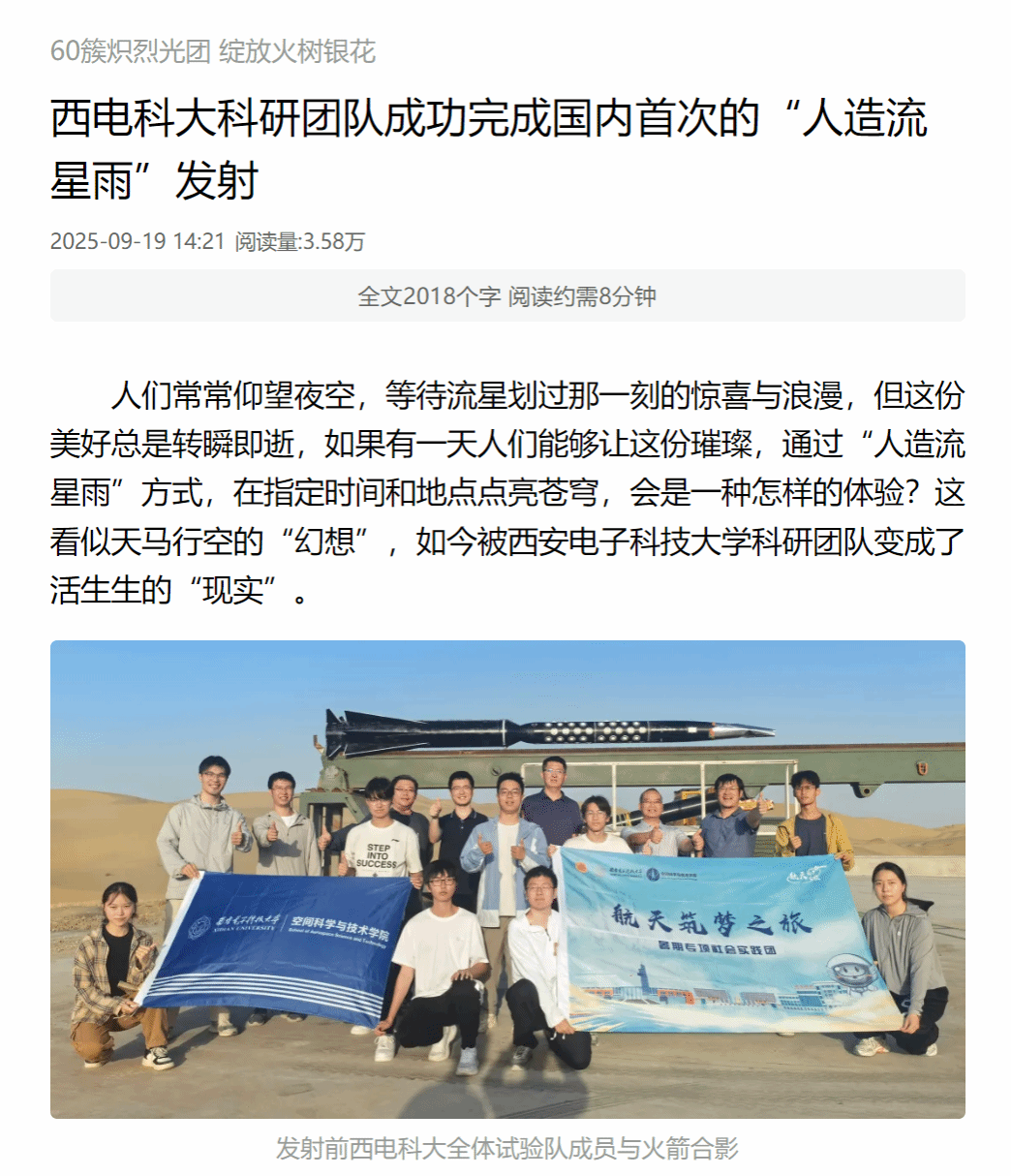 戈壁深处亘古的夜幕笼罩着沙漠万籁俱寂一道黄色光迹划破夜空骤然点亮旷野沉寂的戈壁深处仿佛被悄然唤醒2025年8月12日晚一年一度的英仙座流星雨迎来极大值今年在这片亘古夜幕中还多了另一抹璀璨当晚22时30分一枚名为“信使号流星雨”的试验火箭发出低沉轰鸣腾空而起经历数十秒的穿云破雾它冲出大气在沙漠天幕之巅骤然绽放六十簇炽烈光团宛若火树银花倾泻而下与自然流星交相辉映缓缓洒落于深邃的天幕之中沙漠环线上在数千名沿途游客的共同见证下这场全国首次的“人工流星雨”试验圆满成功科技绽放出的璀璨光芒温柔点亮万里苍穹将理性的精密与感性的浪漫融于同一片夜空这片绚烂光芒的制造者就是MK体育官网MK体育谢楷教授和他带领的“空天电子技术”团队——一支以苍穹为卷、以星火为墨的“造梦者”沙漠环线上在数千名沿途游客的共同见证下这场全国首次的“人工流星雨”试验圆满成功科技绽放出的璀璨光芒温柔点亮万里苍穹将理性的精密与感性的浪漫融于同一片夜空这片绚烂光芒的制造者就是MK体育官网MK体育谢楷教授和他带领的“空天电子技术”团队——一支以苍穹为卷、以星火为墨的“造梦者”2025年9月10日MK体育官网MK体育谢楷教授携空天电子技术研究团队一起向公司博物馆捐赠了“信使号”流星雨试验火箭(1/4缩比模型)和配套流星雨发射器(实物)这件特殊的捐赠品后面有什么特殊的故事自然流星的璀璨向来“可遇不可求”但谢楷教授团队用科技将这份浪漫变为了“可掌控的奇迹”这也引发了校外媒体广泛关注从科学原理解读到技术突破剖析各类报道带公众走进这场“夜空盛宴”让我们看看他们怎么说