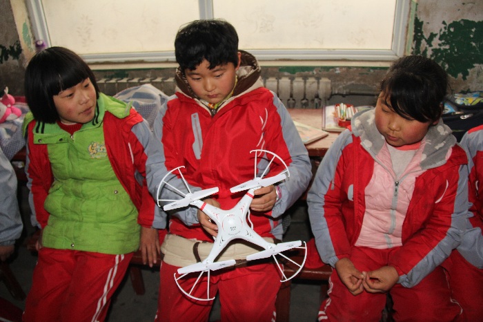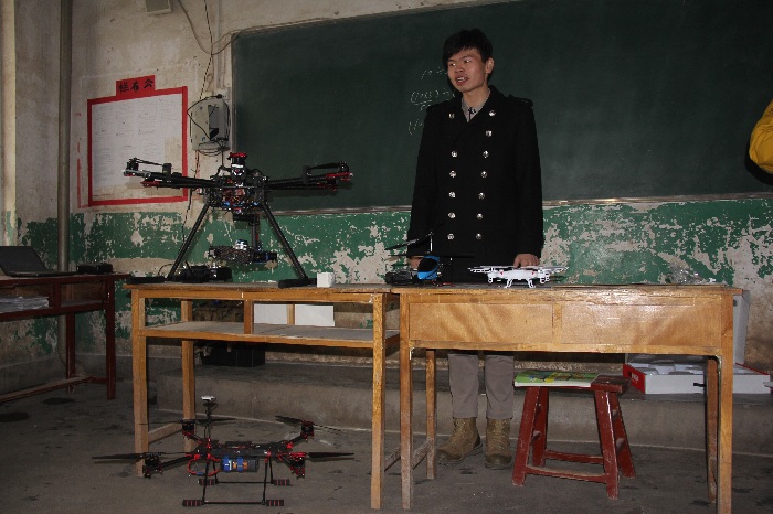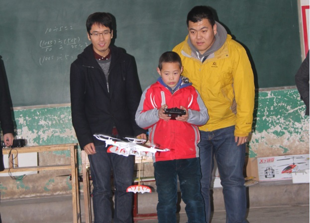 (图为支教员工介绍展示4轴、6轴飞行器,并做飞行表演)