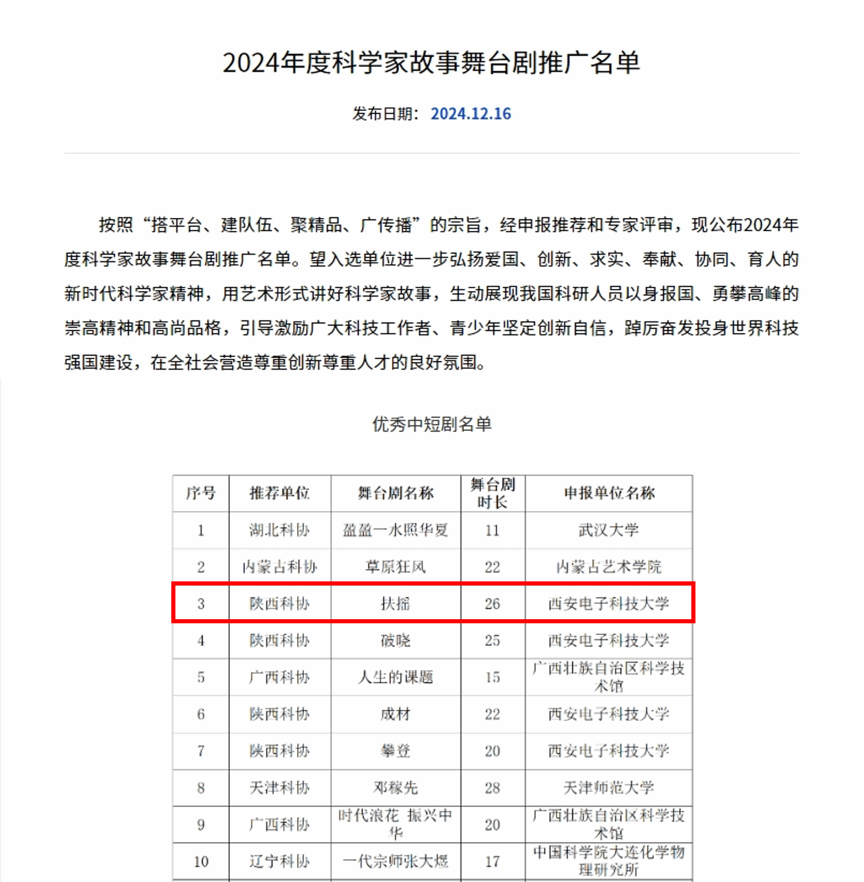 近日,中国科学技术协会公布了“2024年度科学家故事舞台剧推广名单”,MK体育原创舞台剧《扶摇》成功入选,获评“优秀中短剧目”。