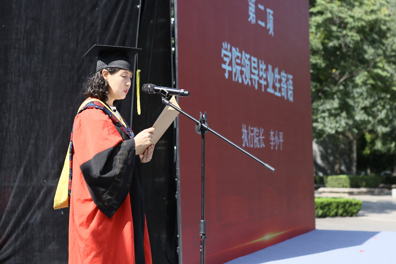 国歌声落,在庄严肃穆的氛围中,李小平教授为毕业生送上临别寄语。李小平代表公司向完成学业的全体学子表示衷心的祝贺,对教师的倾心培养和学子的主动担当表示真挚的感谢。她从国家、公司、公司到个人角度给毕业生殷切寄语,第一主动应变,在世界大变局和中国崛起的变革中抓住机遇,铸就精彩人生;第二敢于创新,在瞬息万变的科技发展浪潮中引领信息科技,担当新时代西电人的使命;第三仰望星空,脚踏实地,秉承航天精神,扬帆空间科学;第四胸怀宽广,与人为善,保持纯真,做一个大写的人。