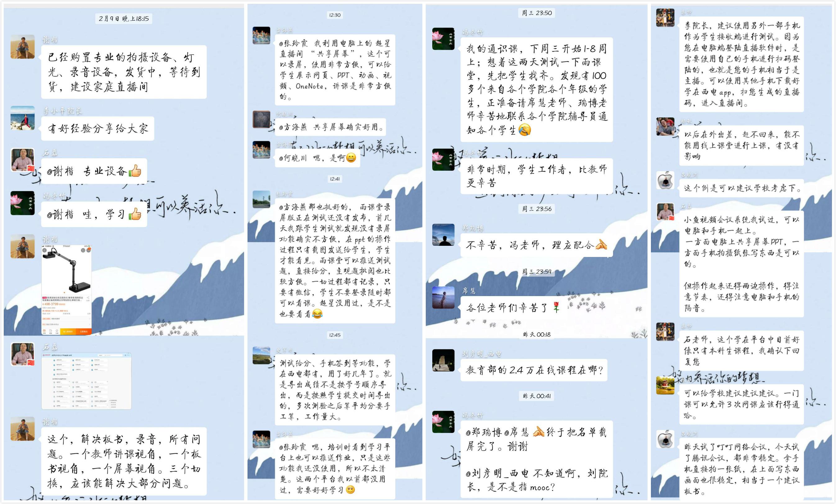 在“MK体育工作群”和“MK体育本科教学群”中,一线教师们不舍昼夜、积极交流,你一言我一语,用最快的速度完成线上建课流程、熟悉线上教学工具、探索线上教学平台、讨论线上教学培训内容,反馈研讨线上教学测试出现的各类问题,为线上课程优化建言献策。