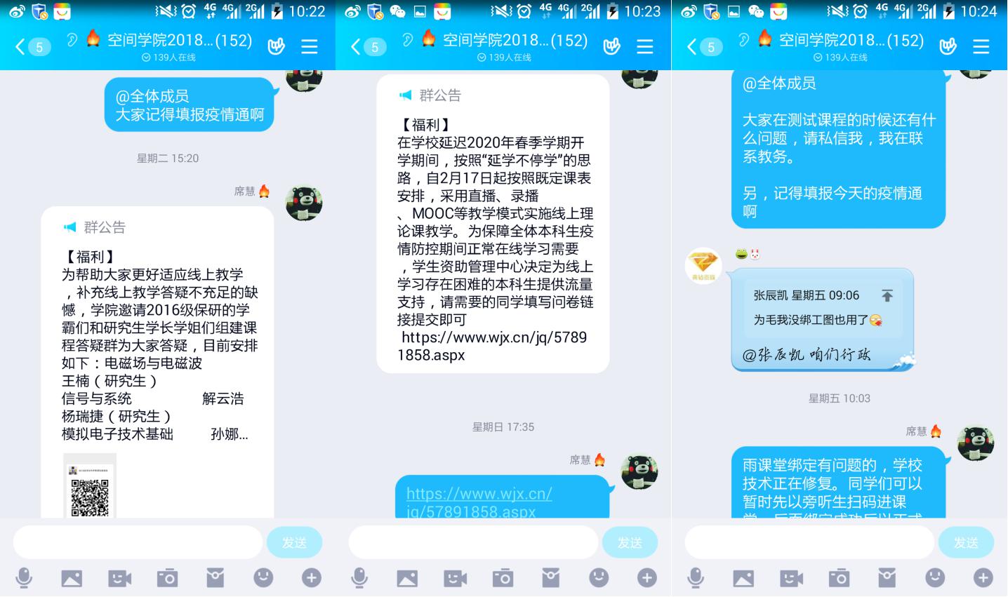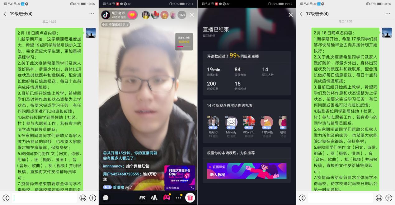“虽然我们相隔千里,但是公司和公司始终与大家在一起”,“作为这一特殊时期的见证者、亲历者和参与者,我们比以往任何时候都能更加真切地感受到中国发展、中国速度和中国力量”,“非常想念大家,希望我们能够早日在西电校园相聚”,2月18日晚19:00,抖音直播间,MK体育2017级、2019级辅导员郑瑞博面向240余名员工开展了一次特殊的“线上点名”。虽然员工返校的进度推迟了,但对员工的教育管理不能推迟,点名过程中,郑瑞博结合公司规定对近一段时间员工的课程学习、疫情防护、时间作息、课余生活提出了要求和建议,并以此次疫情防控阻击战为实例对员工进行了思想教育。与此同时,郑瑞博还传达了公司和公司对同学们的关怀和问候,“在这一特殊的时间段,同学们在学习上和生活上遇到的任何问题都可以随时提出,公司和公司将会尽最大可能予以支持和解决,希望同学们不忘初心、保持信心、坚守决心,我们即将迎来胜利!”