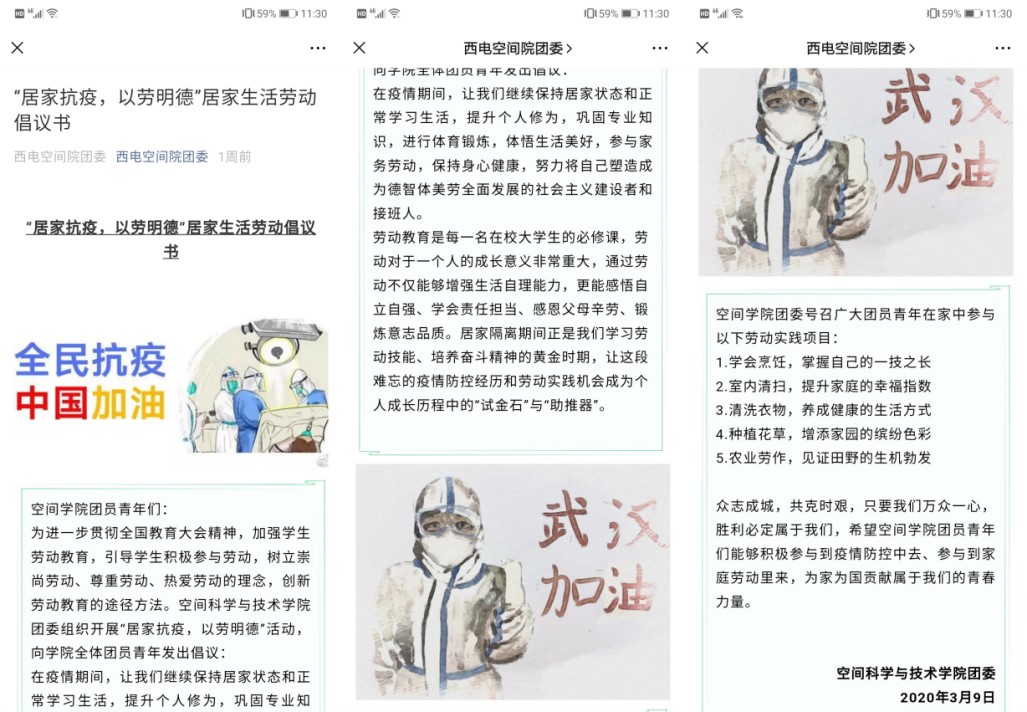 虽然没能身披白衣奔赴一线与时间赛跑,虽然没能全副武装科研攻关与病毒肉搏,但每一名空间学子都在用自己的方式践行青春担当。居家抗疫,以劳明德,空间学子前来报道。