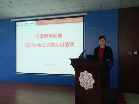 在专题报告中,吴秀霞老师从“为什么要提出践行核心价值观”、“如何将核心价值观内化于心”和“核心价值观与西电精神”三个方面对社会主义核心价值观的提出背景、内涵意义和实践途径进行了阐述。首先,吴老师从国家、社会和个人的角度,用丰富的时政事例和自己工作学习中的经历引出了社会主义核心价值观的概念,具体分析了核心价值观的丰富内涵。关于如何践行社会主义核心价值观,吴老师认为,培育和践行社会主义核心价值观是一项系统工程,关键要解决“信”和“行”的问题。在日常的学习生活中,青年员工必须立足中华优秀文化,讲仁爱、重民本、守诚信、崇正义、尚和合、求大同,积极参与社会实践和志愿服务,在群体中发挥榜样的示范引领作用。最后,吴老师还用六则西电校史中的小故事带领同学们回顾了母校成长发展的峥嵘岁月和光辉历程,半部电台起家的历史让同学们对于艰苦奋斗、自强不息、求真务实、爱国为民的西电精神有了更深的体会。勤学、修德、明辩、笃实,将社会主义核心价值观内化于心、外化于行需要每一个践行者持之以恒的努力和不忘初心的坚持。