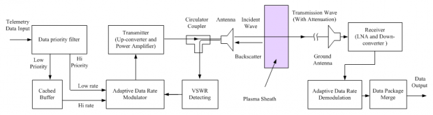 针对这一关键问题,研究团队进一步发现了在碰撞频率与等离子频率比值小于0.3的条件下,天线的驻波和等离子体中电波衰减之间,存在明显的负相关特性。借助两者物理特性上的负关联性,就使得通过检测发射天线端口处的驻波变化,预测等离子鞘套引起的信道容量衰落成为可能。再通过自动调整传输速率以适应信道变化,并引入了数据优先级和暂存机制,最终使自适应通信机制得以实现。
