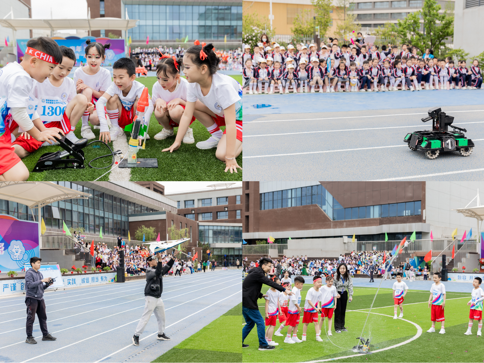 航模在蓝天下俯冲、悬停、旋转、喷烟,引爆现场热潮,在同学们心中埋下了科学与梦想的种子。接下来,孩子们3人小组制作水火箭,助教老师在一旁协助指导,主讲老师阐释步骤,与“小电波”们齐心协力共同完成了水火箭的制作,并在体育场上进行了发射。通过观看航模表演和制作发射水火箭,“小电波”们进一步拓展了科学视野,培养了动手、动脑能力和积极探索、勇于创新的实践能力,为“小电波”们搭建起了零距离接触航天科技的平台。