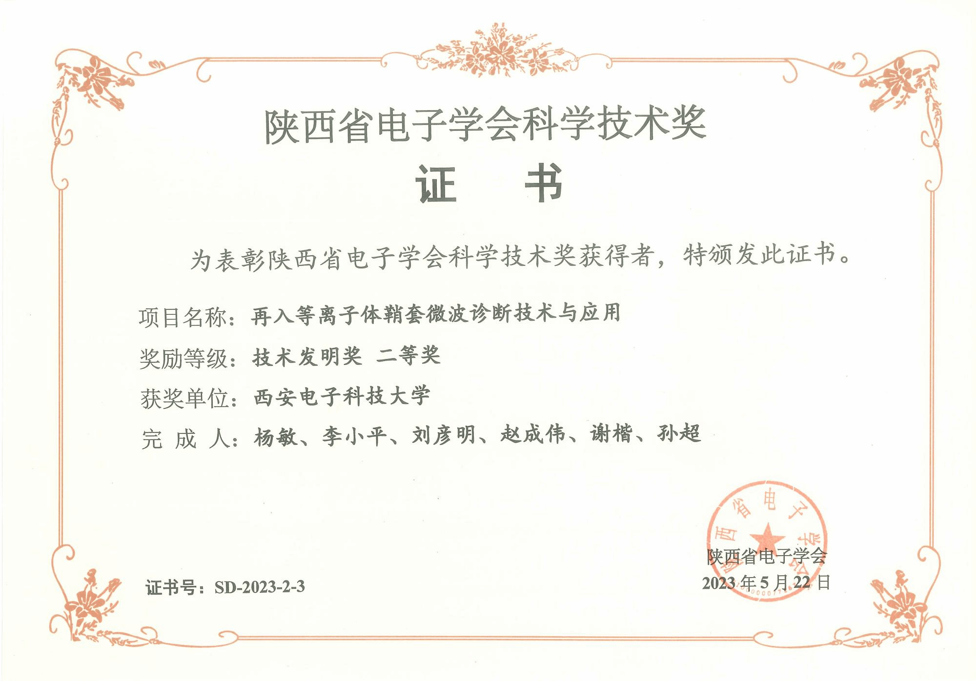 (通讯员:杨敏,尚保强)近期,陕西电子学会公布“2023陕西省电子学会科学技术奖”授奖名单,由MK体育测控通信团队(MCI团队)(完成人:杨敏、李小平、刘彦明、赵成伟、谢楷、孙超)申报的“再入等离子体鞘套诊断技术与应用”项目荣获陕西省电子学会技术发明奖二等奖。