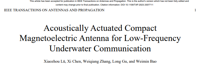 (通讯员 吕晓洲)近日,天线领域国际著名学术期刊《IEEE Transactions on Antennas and Propagation》(中科院二区Top,IF=5.7)在线发表MK体育柔性传感技术研究所吕晓洲教授团队的最新研究成果“Acoustically Actuated Compact Magnetoelectric Antenna for Low-Frequency Underwater Communication”(DOI: 10.1109/TAP.2023.3307711)。该研究提出了一种基于声驱动的小型化低频磁电(ME)天线(频率:91.8 kHz,尺寸:14*6*0.5 mm3),利用磁电耦合效应实现“磁-声-电”三个物理量之间的相互转换,验证了ME天线用于水下无线通信的可行性,有望为海洋通信探测提供新思路。团队吕晓洲教授和陈茜博士为该论文共同第一作者,吕晓洲教授为论文通讯作者。