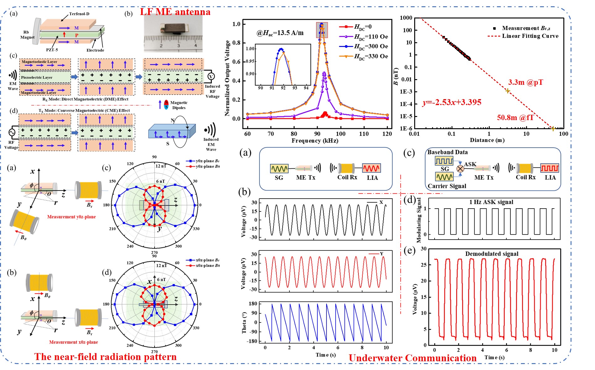 针对这个问题,在国家重点研发计划项目的支持下,柔性传感技术研究所吕晓洲教授团队提出一种基于Terfenol-D/ PZT/Terfenol-D层状结构的ME天线,采用铷磁铁提供直流偏置磁场进一步缩小了天线尺寸。所提出的ME天线在y0z平面和x0z平面的近场辐射特性与磁偶极子天线相当。ME天线在电导率为5 S/m的盐水环境中能够实现电磁波的发射和接收,并且通过ASK调制实现了短距离有效通信。在今后的工作中,将进一步研究改进材料和器件结构,以解决磁电天线因机械损耗大而导致辐射效率低的问题,进一步提高ME天线在海水中的通信性能。