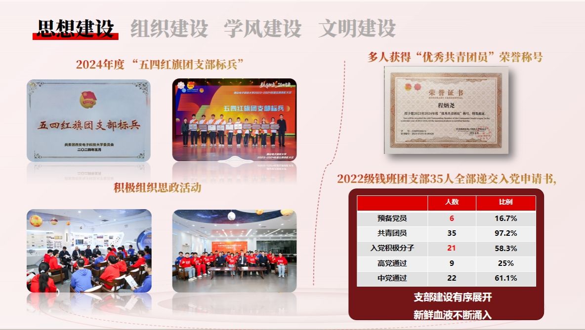 思想建设引领,信念坚定。2022级钱学森班共有36人,全部递交入党申请书。现有预备党员6人,发展对象3人,入党积极分子21人,多人获评“优秀共青团员”,班级在2024年度五四评优中获得了“五四红旗团支部标兵”荣誉称号。2022级钱学森班坚持培育员工坚定的科技报国理想信念,围绕习近平总书记关于教育的重要论述及重要讲话开展热议,积极举办内涵丰富形式多样党课团课学习,引导青年学子踔厉奋发,挺膺担当。