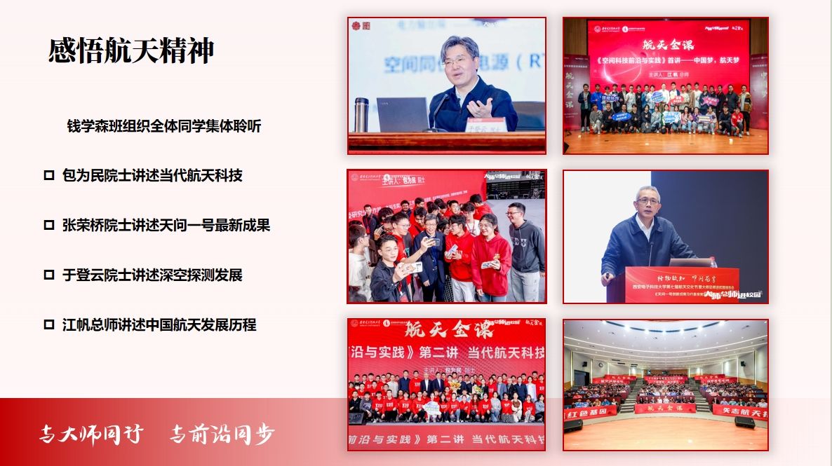 精神文化熏陶,培根铸魂。2022级钱学森班坚持赓续红色根脉,厚植家国情怀,以航天精神和钱学森精神为理想航标和价值追求。班级以“航天文化节”和《空间科技前沿与实践》课程等为载体,邀请包为民院士、于登云院士、张荣桥院士、武向平院士等大师总师与员工面对面交流座谈,持续深化文化浸润,弘扬航天文化,让科技报国、航天报国成为员工的价值追求和行动自觉,为建设航天强国汇聚磅礴力量。